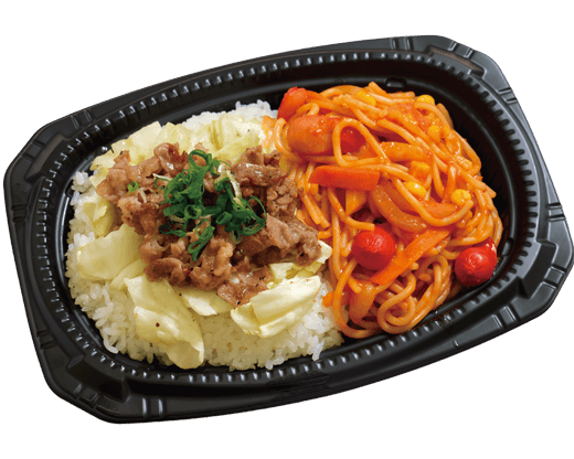 まんぷくはみだし弁当第229弾★ネギ塩牛焼肉丼と洋食屋さんのナポリタン 800円(税込)